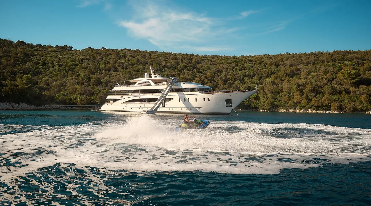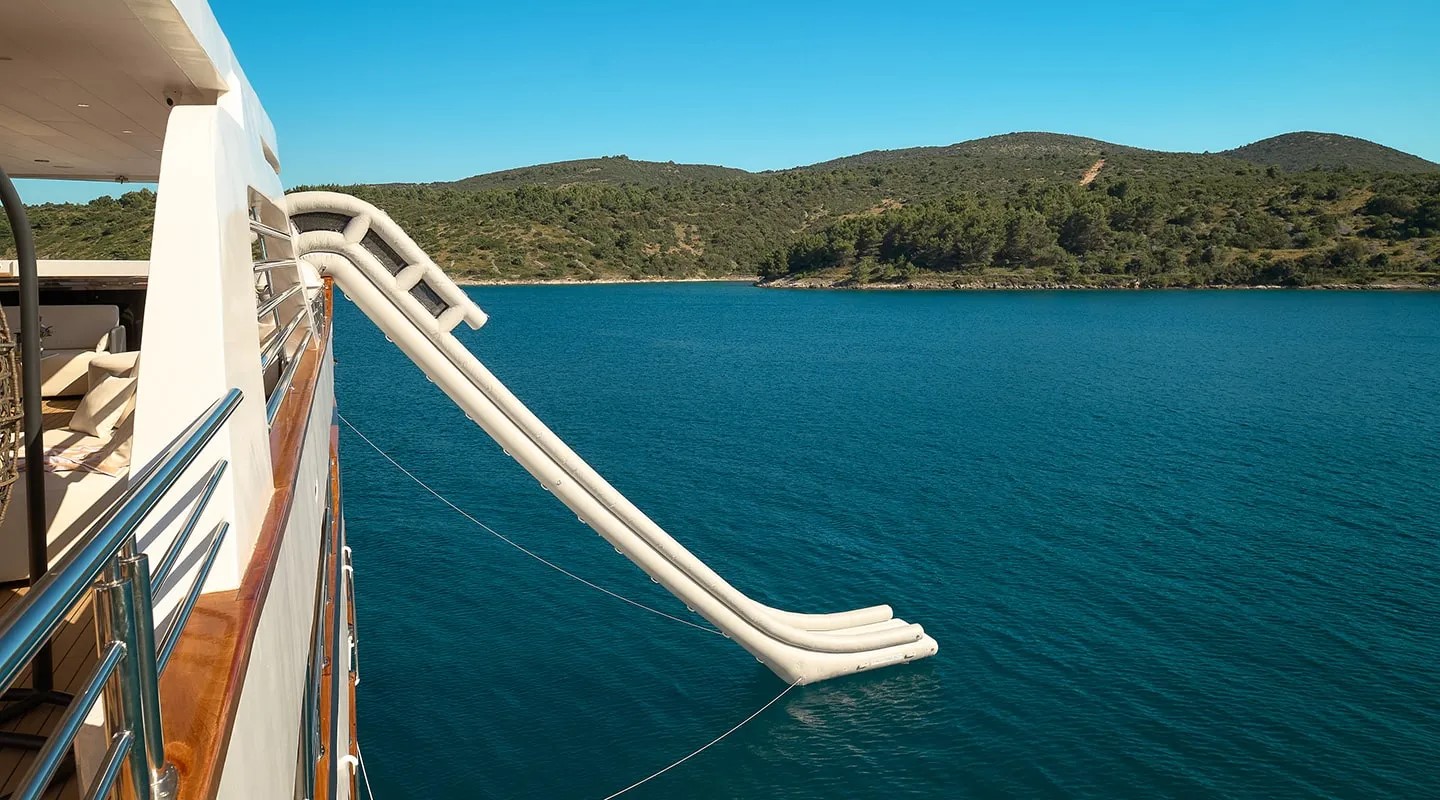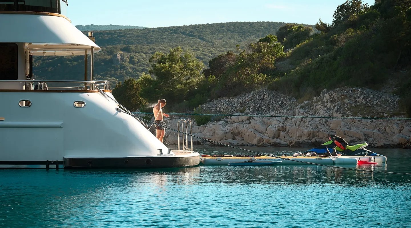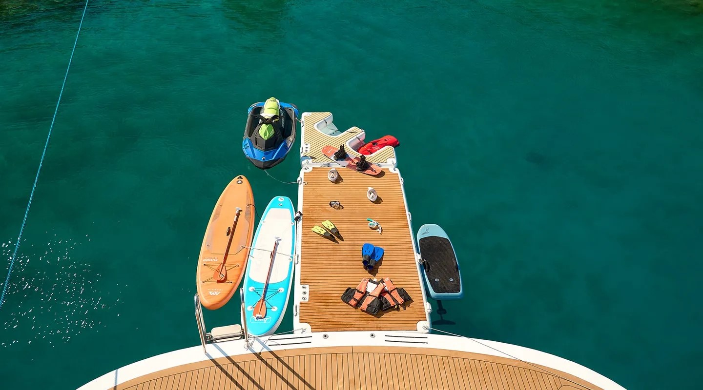Тендерная лодка 650 с подвесным двигателем Yamaha 175, гидроцикл, 2 SeaBobs, E-Foil, 2 каноэ, 3 доски для гребли, плавающие платформы для купания, водная горка, поплавки и снаряжение для сноркелинга, надувные платформы для купания, Wi-Fi-интернет. |