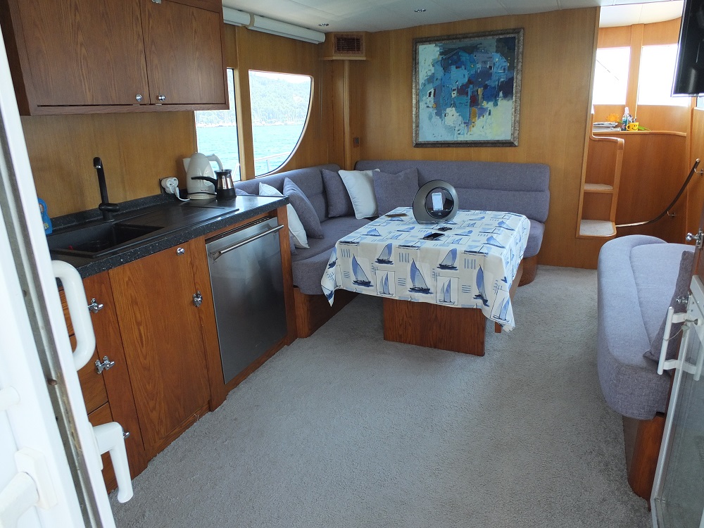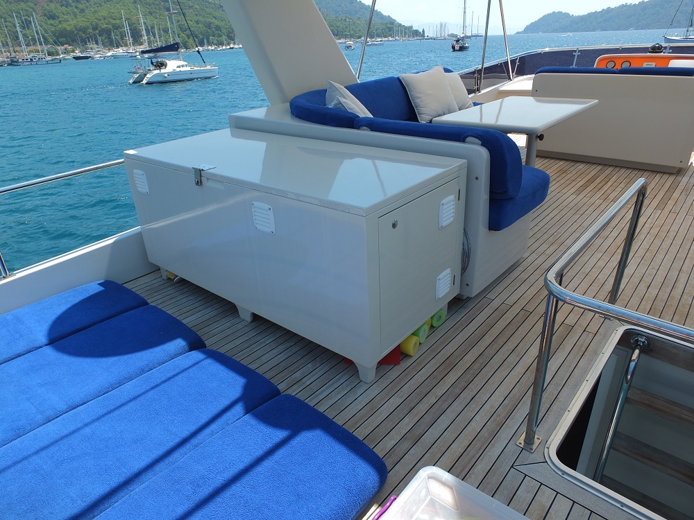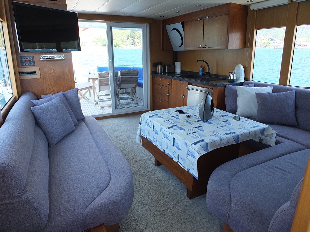 | ТВ-система, только в салоне, спутниковое ТВ, музыкальная система, колонки на палубе, подключение к Интернету, ТВ, DVD, CD-стерео, мобильный телефон, GPS, радио VHF, льдогенератор, палубное оборудование, солнечные матрасы, душ на палубе, морской трап |