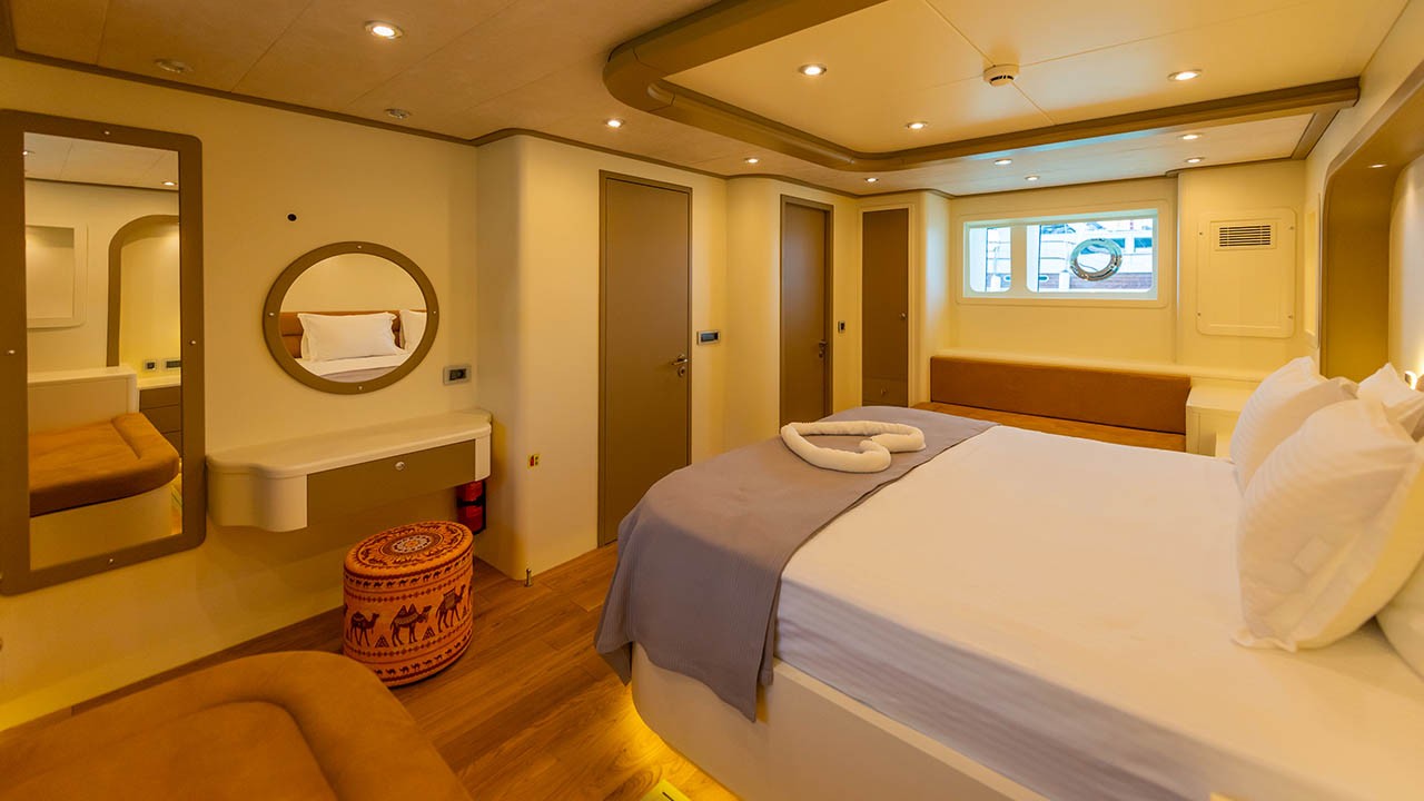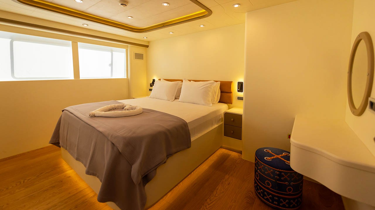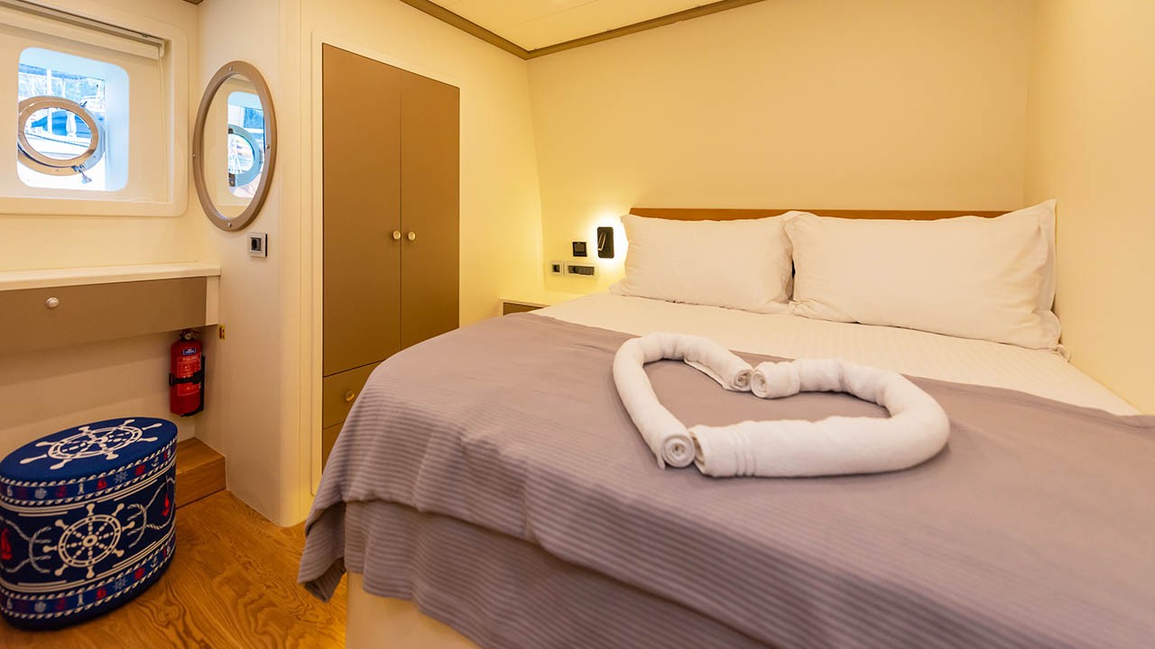 | 6 кают, включая: 2 каюты класса «мастер» с двуспальной кроватью и 4 двухместные каюты. Все каюты оборудованы собственной ванной комнатой, индивидуальным кондиционером с дистанционным управлением, спутниковым телевидением, музыкальной системой, унитазами с кнопочным смывом, фенами и огнетушителями. |