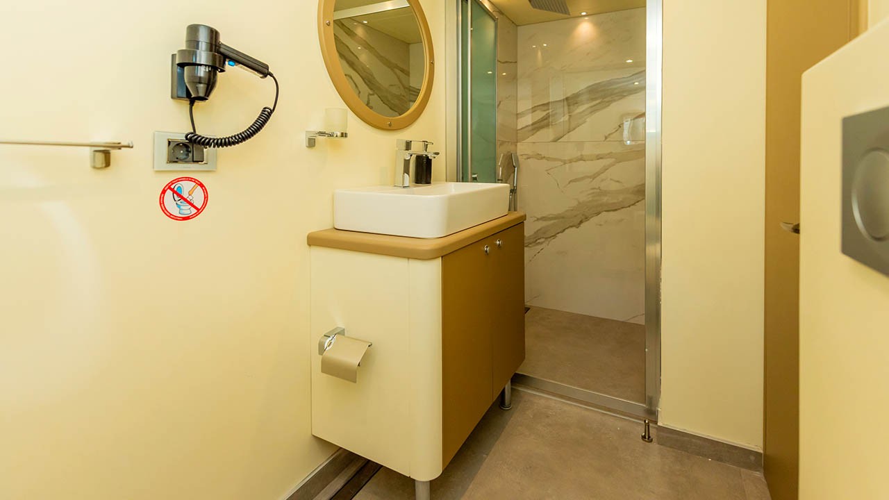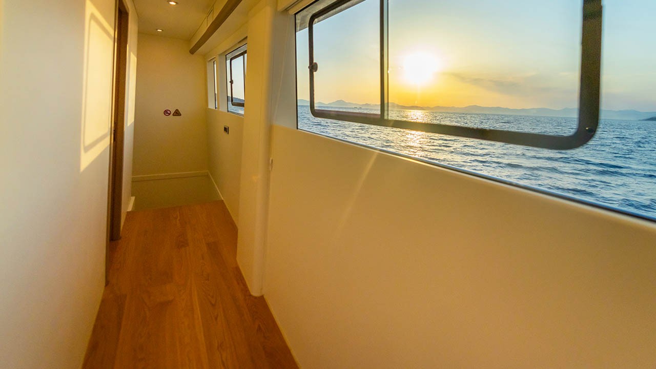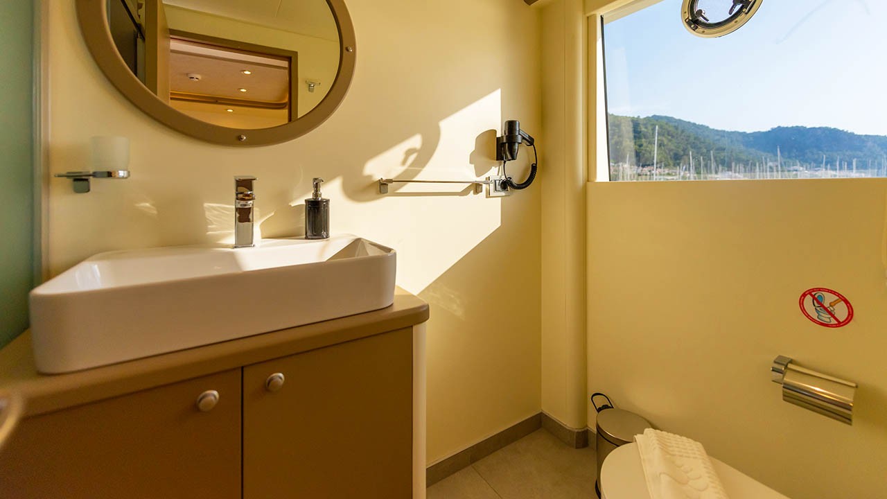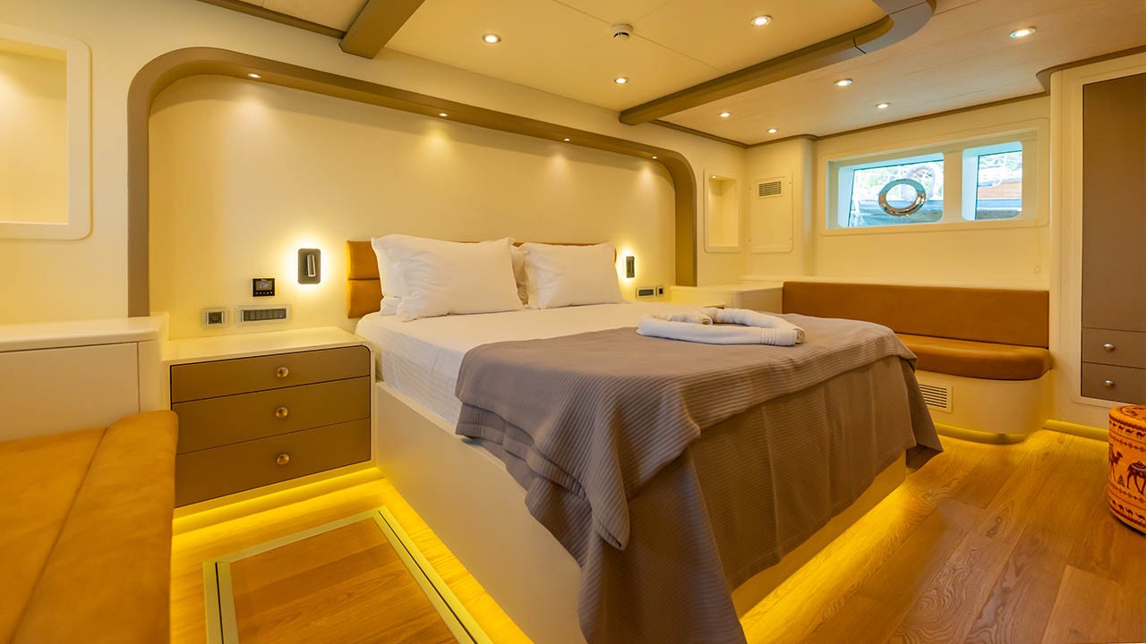 | 6 кают, включая: 2 каюты класса «мастер» с двуспальной кроватью и 4 двухместные каюты. Все каюты оборудованы собственной ванной комнатой, индивидуальным кондиционером с дистанционным управлением, спутниковым телевидением, музыкальной системой, унитазами с кнопочным смывом, фенами и огнетушителями. |